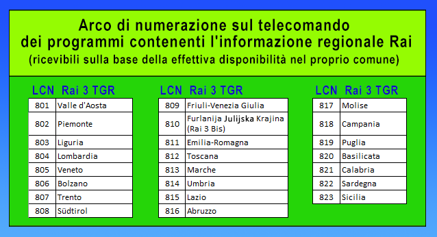 I programmi regionali disponibili nella propria regione sono selezionabili sui canali da 801 a 823 del telecomando. Durante la risintonizzazione potrebbe essere richiesto di scegliere la programmazione regionale. In ogni Regione, infatti, è possibile scegliere in linea generale tra tre diverse programmazioni regionali. Pertanto, all'utente è lasciata la libertà di scegliere quale contenuto regionale alla posizione n.3 del telecomando desidera.
